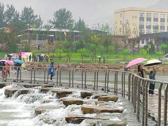 10月1日正式对外开放的汾河五期老龙头景区,吸引了大量市民前往游览。土堂怪柏、西山叠翠、福喜稻田……最受欢迎的是二号跌水堰108米长的步步生莲桥。图为10月5日,游人撑伞依次走过该桥的160个莲花汀步。记者安晓奕摄