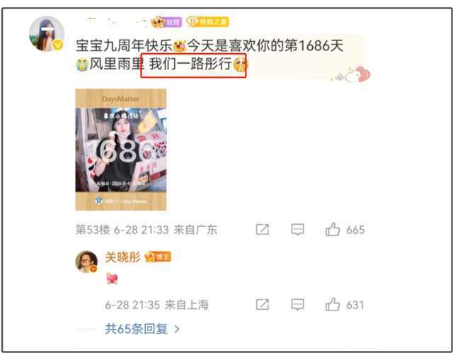 而除了鹿晗的行为外,关晓彤的操作也让大家忍不住想两人是不是真的没分手。在鹿晗演唱会当晚,关晓彤在评论区回复也引发了争议,有粉丝在评论区表示喜欢关晓彤1686天,喊话“风里雨里,我们一路彤行”,关晓彤回复了一颗红心。鹿彤CP粉看到后认为关晓彤相当于明牌了“一鹿彤行”,毕竟是一个谐音梗,只是字稍微不一样。