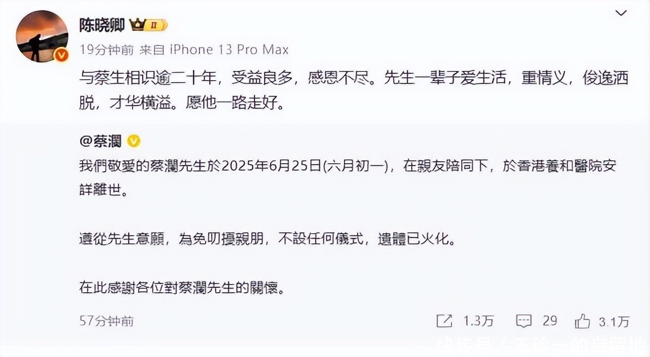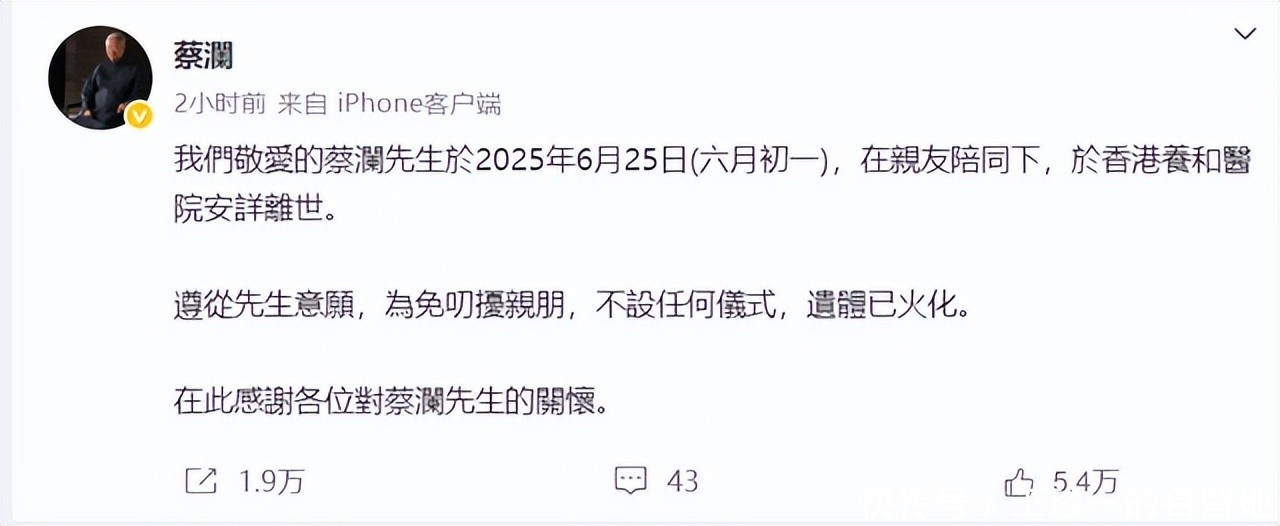 讣告还提到蔡澜的遗体已经火化,不会举办任何仪式。